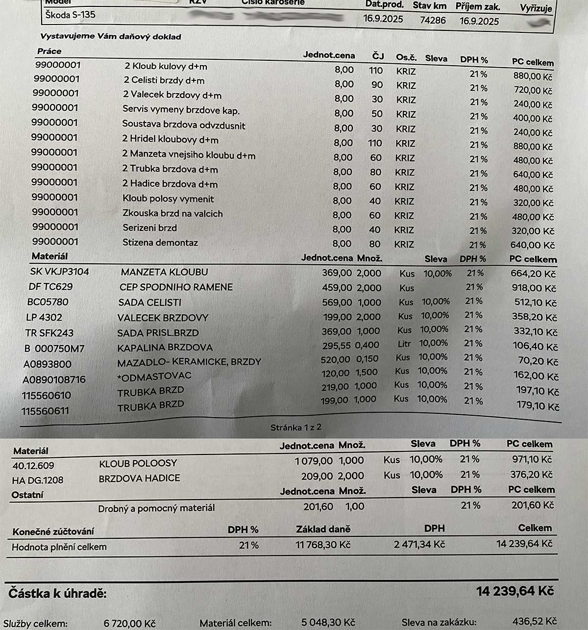 Pro opravu brzd i výměnu kulových čepů tentokrát vybírám Autocentrum Jičín. A současně už přišel čas i na novou brzdovou kapalinu. Zakázka se však nečekaně rozrostla o další věci. U zadních brzd se měnily čelisti a válečky plus brzdové trubky a hadice. U přední nápravy byl dále shledán špatný stav manžet vnějších kloubů. S jejich výměnou jsem souhlasil, jenže se při ní jeden kloub rozpadl. Takže taky nový. V Jičíně mi tak vystavili fakturu na 14 240 Kč. Mimochodem si prý museli vymyslit hodinovou sazbu, protože Favorit se u nich 10 let neukázal. Pokud to z faktury dobře čtu, napařili mi 968 Kč vč. DPH za 1 hodinu práce (8 Kč bez DPH za 1 časovou jednotku, hodina má ve Škoda servisech 100 jednotek). Všechny díly servis zakoupil v Auto Kelly, originály od Škody dávno nejsou.