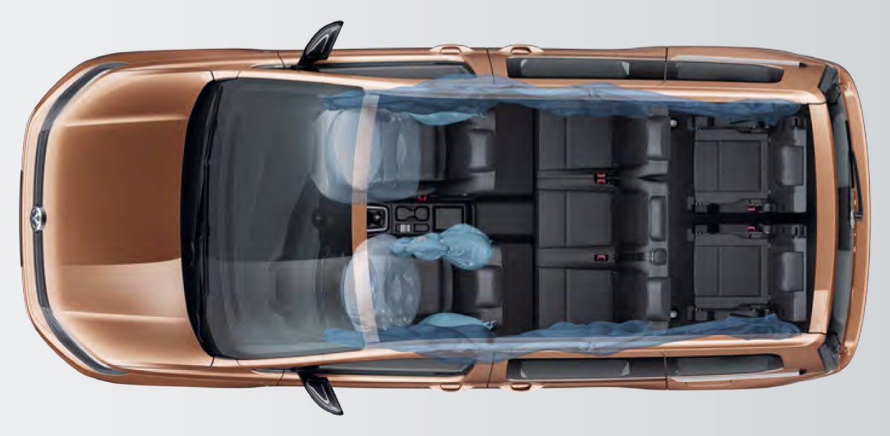 Standardní výbavou osobních variant je sedm airbagů. Kromě obligátní šestice (čelní, boční, hlavové) tu vždy bdí také středový airbag ukrytý v řidičově opěradle. Brání střetu hlav vpředu sedících osob při bočních nárazech. Žádné další airbagy už v Caddy 5 neexistují, tedy se zde nedočkáte kolenního ani zadních bočních. Vždy sedm, ve všech osobních verzích. Velkoplošné hlavové airbagy chrání též cestující ve třetí řadě, což platí pro krátkou i dlouhou karoserii.