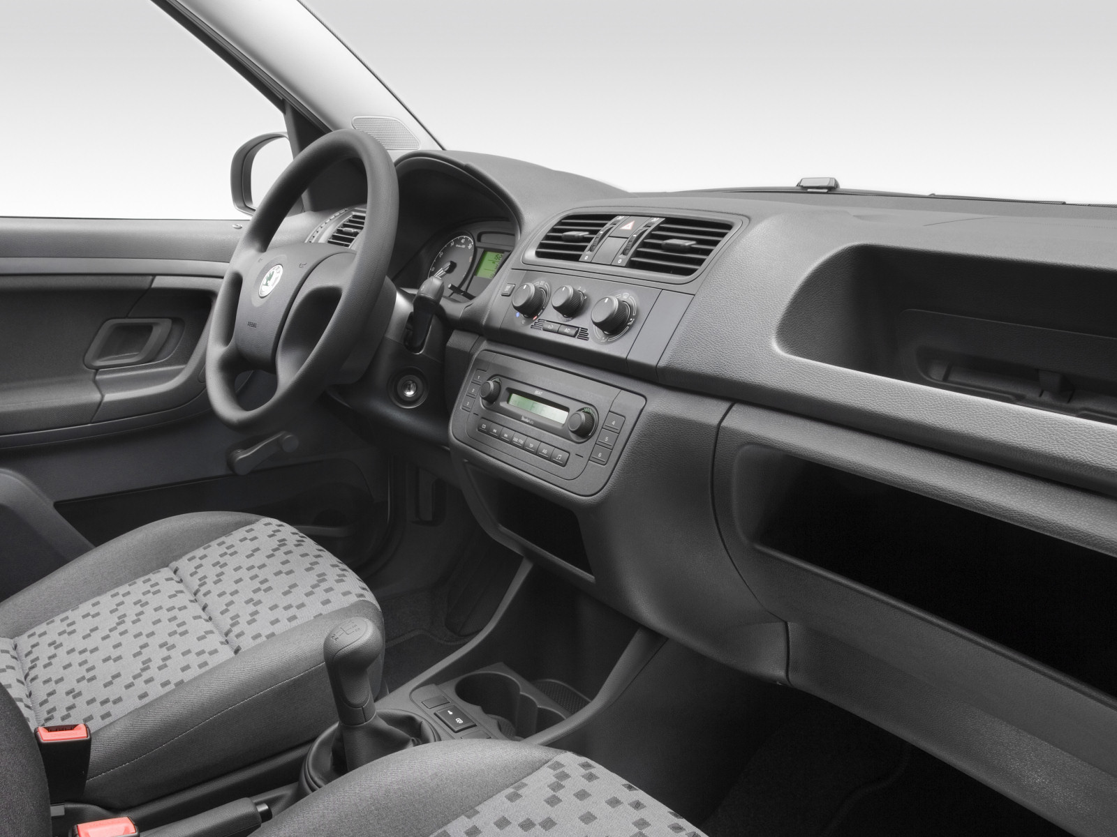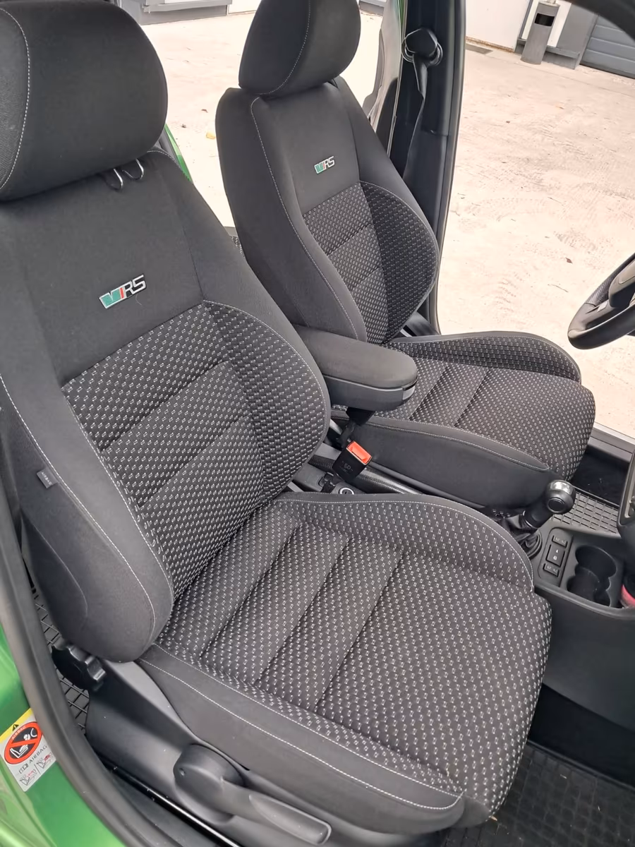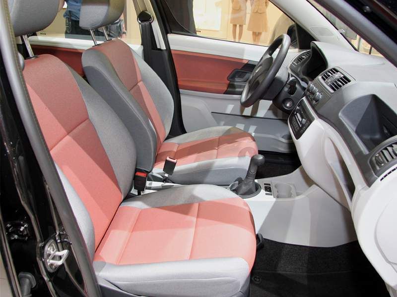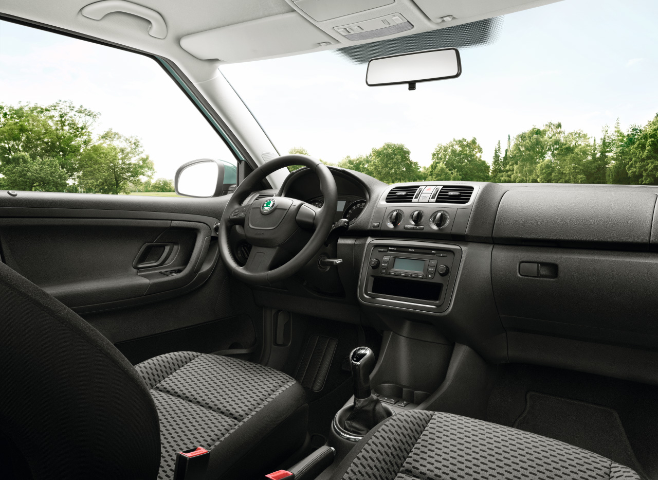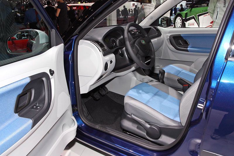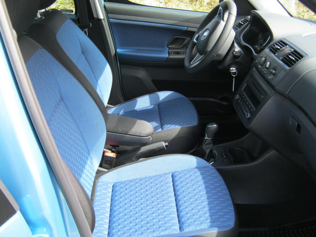 Vzor potahů je totožný se vzorem z jedničkové Fabie po faceliftu v úrovni Classic (tam se jmenoval Fresh). Byl v nabídce s plasty Onyx/Onyx nebo Onyx/Stříbrnošedá, ale do pracovního auta si světlou variantu asi nikdo nevybral.