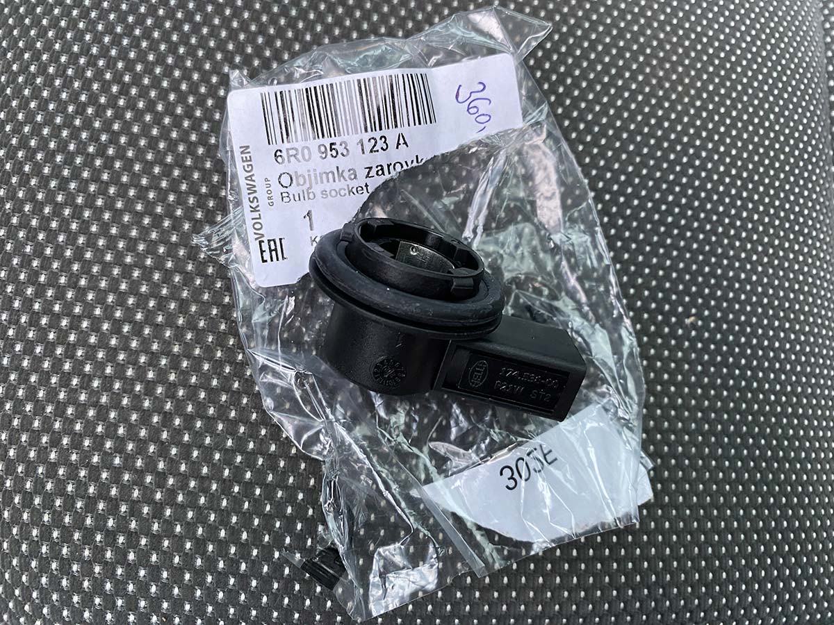 Denní svícení na pravé straně začalo po čase zase stávkovat, řešení spočívalo v nové objímce žárovky s objednacím číslem 6R0 953 123 A za 360 Kč. V původní se již žárovka moc vrtěla a ztrácela kontakt. Pro jistotu však dávám rovnou i novou žárovku. Celé těleso mlhového světla ale bude brzy také na výměnu, protože jeho plast je kolem objímky žárovky teplem roztavený a objímka v něm už špatně drží. Na levé straně již bylo světlo měněno před rokem a půl.