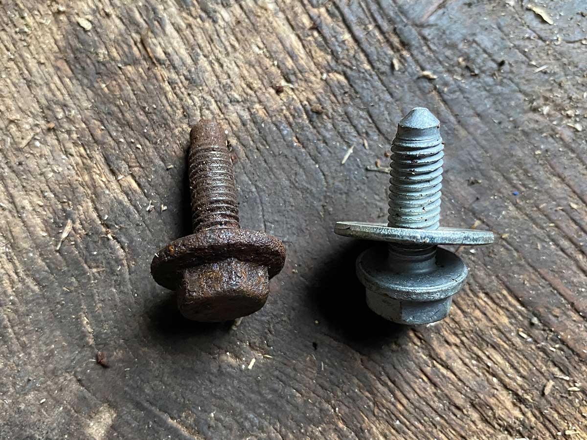 V půlce prosince měním přesně po roce a nájezdu 13 052 km olej. Spodní ochranný kryt motoru opatřuji dvěma novými šrouby, staré už nevypadaly vůbec hezky. Překvapivě není žádná sranda sehnat stejné. I po namáhavém pátrání dorazily z e-shopu trochu jiné a tak jsem musel přidat ještě podložku.