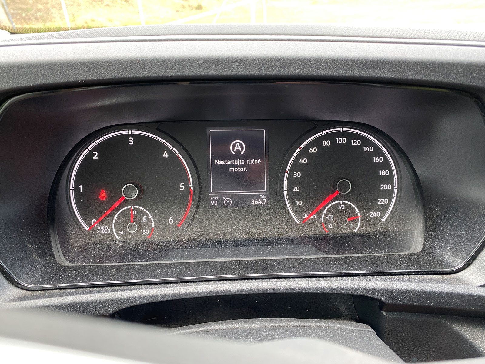 Podívejte se na tu legrační hlášku na displeji. Zobrazí se, pokud start-stop vypne motor, vy vystoupíte a jdete třeba otevřít bránu. Pak už při sešlápnutí spojky sám nenaskočí a musíte nastartovat „ručně“ :-D