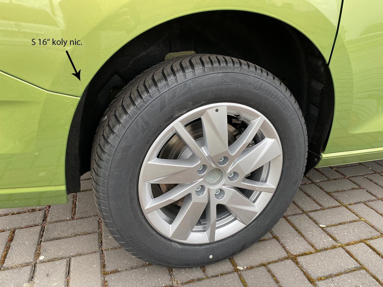 Konfigurátor umožňuje opatřit vůz z výroby celoročními plášti. Fabrika obouvá dva typy: Bridgestone Weather Control A005 nebo Continental AllSeasonContact. Nelze si bohužel vybrat, které obují na objednaný vůz. Já doufal v Continentaly, protože jejich zimní výkony jsou dle testů podstatně lepší než u Bridgestonů. No mé doufání nebylo nic platné. Auto přijelo na Bridgestonech. Ty jsou mimochodem vyrobené v Maďarsku a tak mě hřeje aspoň pocit, že nejezdím s čínskými letními plášti Giti, které by Caddy dostal defaultně.