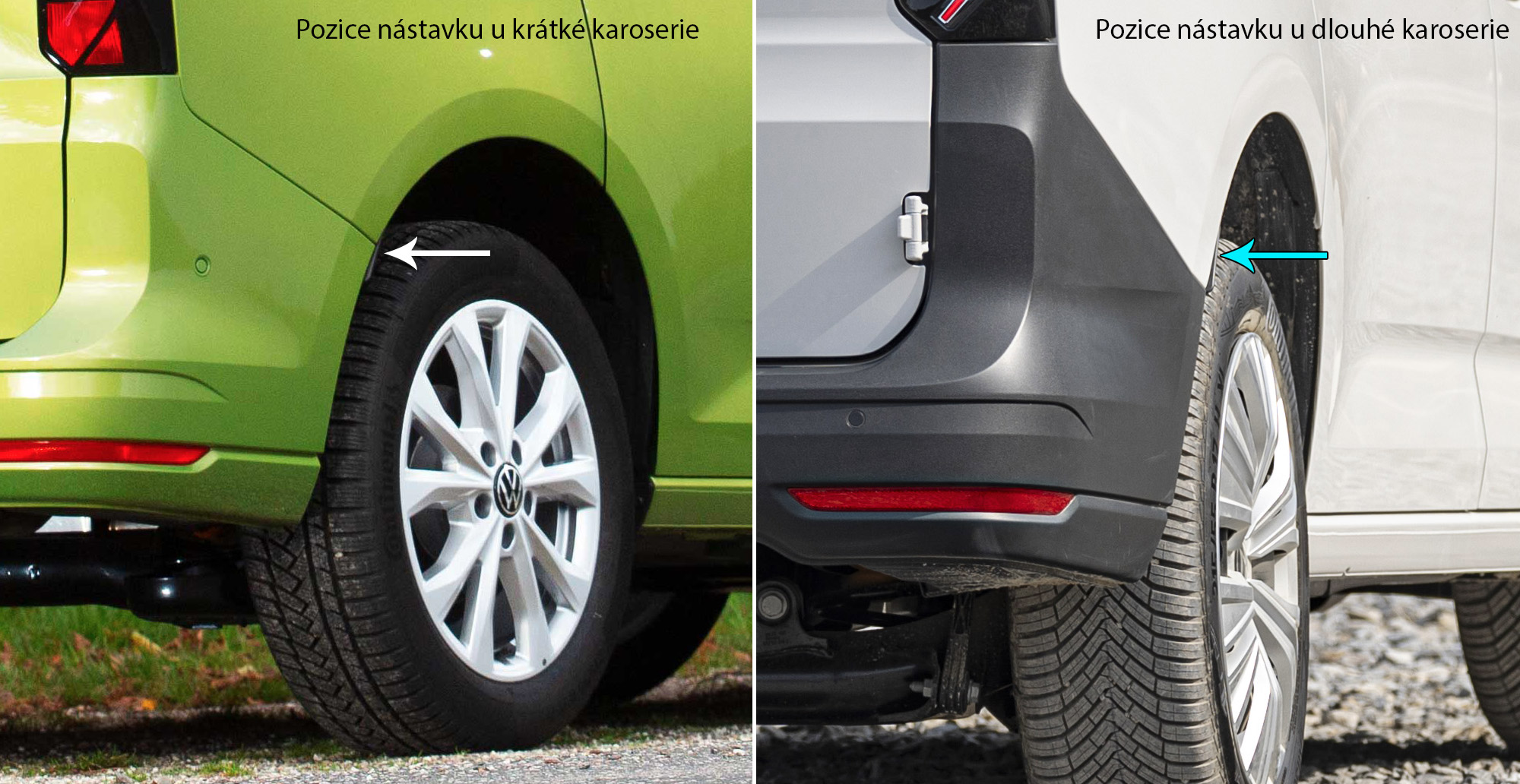 Zajímavost: pátral jsem, proč některé kusy mají tyto plastové minizástěrky za zadními koly a některé ne. Původně jsem se domníval, že byly přidány v rámci modelové péče někdy od roku 2024 a jejich smysl je buď aerodynamický nebo mají funkci okapničky. Ale není to tak. Totiž některé Caddy je mají od počátku výroby a některé ne (můj vůz např.). Proč? Klíčem není ani délka karoserie, ani výbavový stupeň, nýbrž velikost kol: 15" a 16" se obejdou bez nich, 17" a 18" je mají. Nemají žádný praktický přínos, jejich přítomnost je vyžádána homologačním předpisem, jenž praví, že kolo musí být uvnitř karoserie. Což u širších kol právě tento přílepek zajistí.