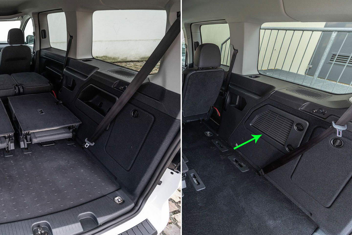 Sedadla ve třetí řadě jsou u páté generace Caddyho samostatná a víceméně převzatá z modelu Touran. Proti němu jsou však navíc vyjímatelná. Na bocích jejich konstrukce nechybí madla pro případný přenos, bohužel se během něj často samovolně rozkládají. Ve složeném stavu totiž opěradlu chybí aretace (na rozdíl třeba od zadních sedaček VarioFlex u škodovek Roomster, Yeti a Karoq).