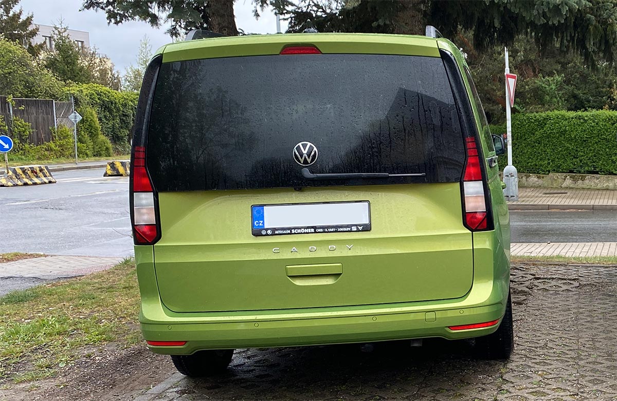 Zadní svítilna nezůstává pozadu. V podstatě žádný designový podpis tvořený pěti žárovkami jako u Caddy 4. Jediná žárovka tu obstarává jak koncové, tak i brzdové světlo. Pokud se nepletu, u škodovek to tak naposledy měla Octavia Combi první generace. Plně chápu, pokud to někoho u auta startujícího v roce 2024 na šesti stech tisících korunách uráží. Dále mě překvapilo, že zadní mlhovka je pouze vlevo, ačkoliv má auto tažné zařízení. Dosud jsem se domníval, že vozy s koulí z výroby mají zadní mlhovky dvě. Naopak couvací světla jsou díkybohu v obou svítilnách.
