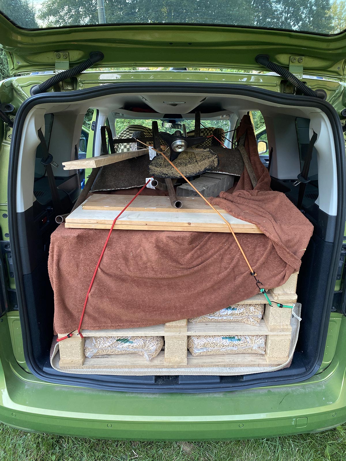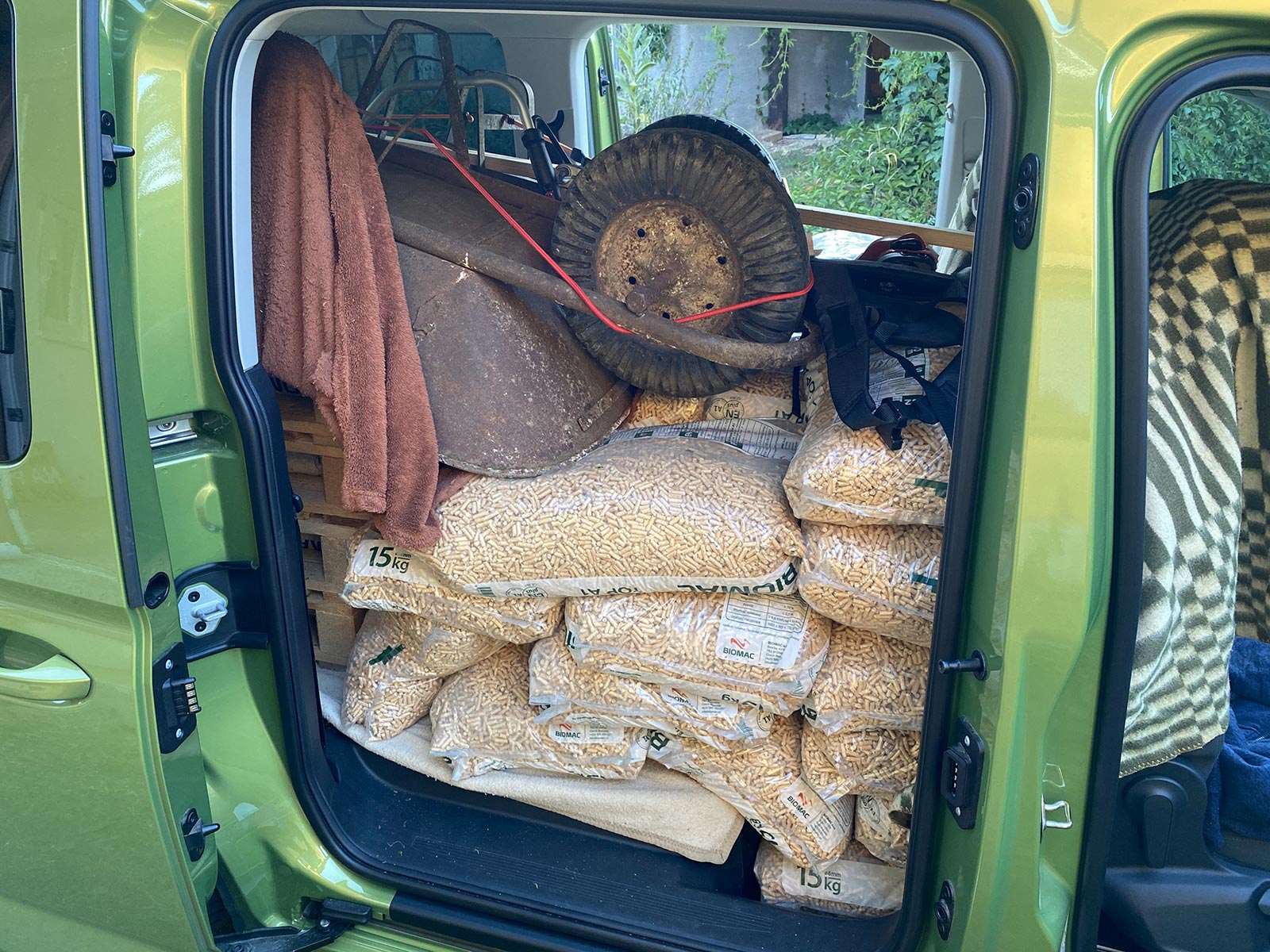 V průběhu podzimu byl Maxík pracovním mezkem. Pomáhal mi s dalším stěhováním a vyklízením domu. Často tahal vozík, jednou měl dokonce plně využitou užitečnou hmotnost včetně maximální povolené hmotnosti nebrzděného vozíku. Bylo totiž potřeba převést 70 patnáctikilových pytlů s peletami (dohromady 1050 kg) + dva dospěláci a dvě děti (odhadem 190 kg). Vozík samotný váží kolem 250 kg, celkem si tedy vůz musel poradit odhadem skoro s 1,5 tuny nákladu. Zvládl to bez problémů. Na Caddy je hodně znát jeho užitkové zaměření. I při velkém zatížení totiž záď klesá jen mírně a potkávací světla jsem zatím nikdy nemusel sklápět níž než do třetího stupně (je jich sedm). A co vám budu povídat, ten dvoulitrový diesel se k takové práci hodí jako zadek na hrnec. Prostě paráda.