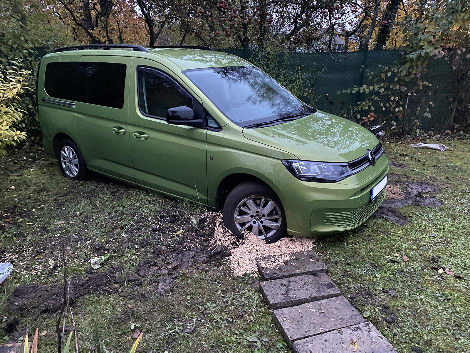 Caddymu pomohla až odtahovka. Moje nešikovnost mi z kapsy tahá 3 000 Kč a na památku zůstal zespodu odrbaný nárazník od betonových dlaždic a poškrábané disky kol od podsypávání štěrku. Bože bože.