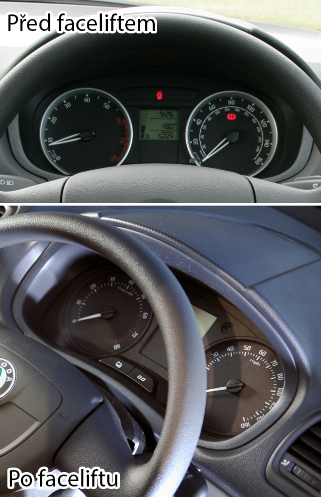 Pravděpodobně během faceliftu došlo k změně struktury povrchu plastů na palubní desce. Výraznější rozdíl byl u tvrdé části pod čelním oknem (první obrázek), jiný rastr však má i měkčený potah (druhý obrázek).